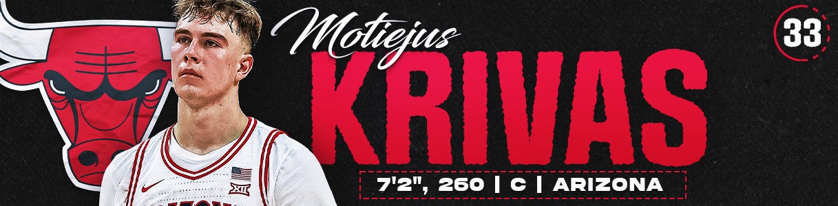 Corey: Arizona freshman Koa Peat feels like the most archetypal prospect in the class for a Bulls front office led by Artūras Karnišovas. Built like a football player, Peat moves with the fluidity, grace, and explosive power of a top edge rusher. He can play above the rim, create his own shot in the midrange, defend multiple positions, and be a vital, versatile contributor. He has played whatever role his team needs, for the best team in the country, even if he often sacrifices his own stats in the process. While his outside jumper requires significant development, as he often lacks the confidence to shoot unless he is completely wide the F open—NBA teams have shown patience with talented prospects whose main flaw is a developable jump shot. As Chicago finally commits to a rebuild, Peat could become a foundational frontcourt piece for years to come.