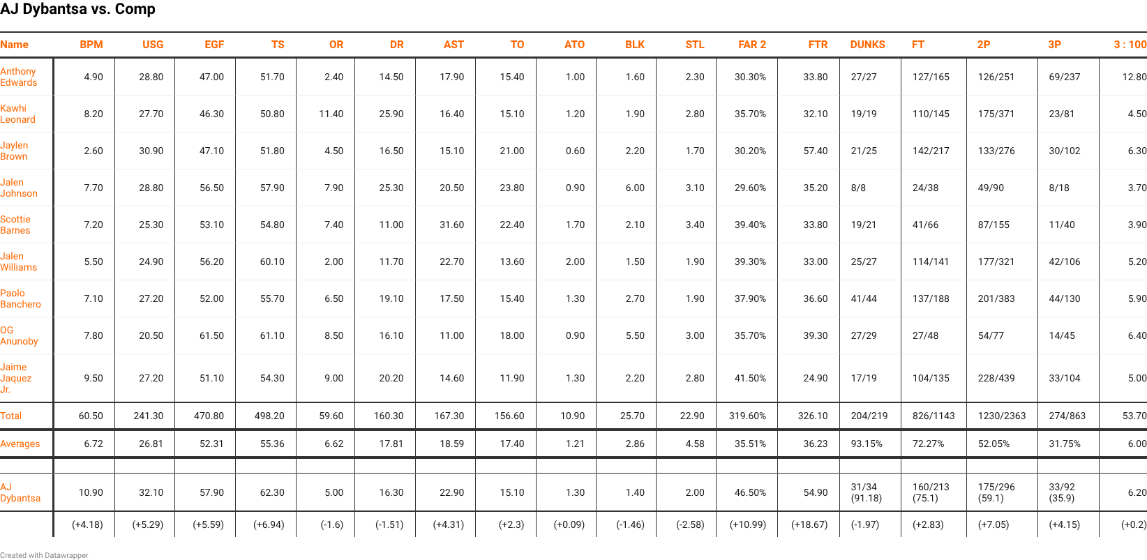It’s also worth noting that Jalen Williams—who was about 21 years old when he was drafted—is only slightly higher in Block Percentage. Perhaps it’s not crazy to project AJ on par with J-Dub’s developmental curve or those of other players, due to the fact that Dybantsa is a true freshman? It’s certainly something to consider.