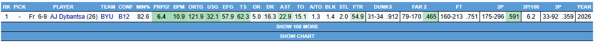 We may spend a little bit of time in this section for AJ. There is some interesting polarization for Dybantsa when it comes to his analytical profile. In terms of being an outlier, AJ is special in a real way. He is the only freshman in the BartTorvik database (dates back to 2008) who has ever done the following: