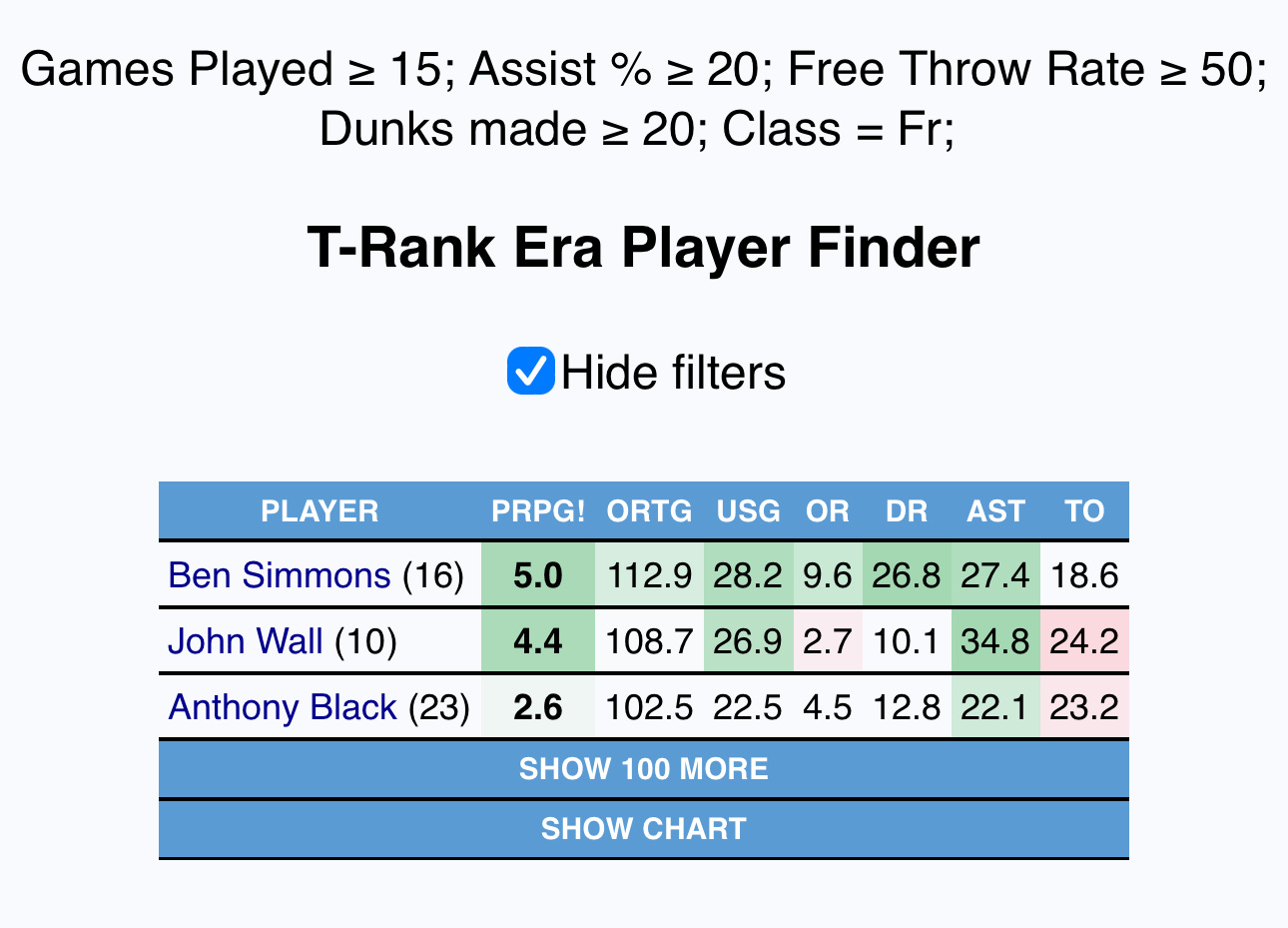 Even without a threatening jump shot, Black has been able to pressure the rim in ways that players who struggle to shoot shouldn’t be able to do. To put in perspective how impressive Black has been at getting into the paint this season, I went to Barttorvik to create a query identifying rim pressure and playmaking. Plugging in freshman prospects that have had an Assist%>20, Dunks>20, and Free Throw Rate>50 resulted in only three players accomplishing this feat since 2008. Those players were John Wall, Ben Simmons, and Anthony Black.