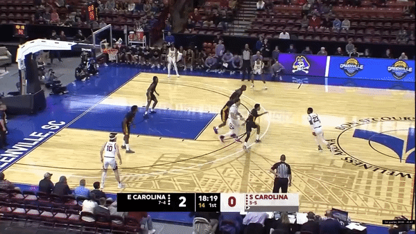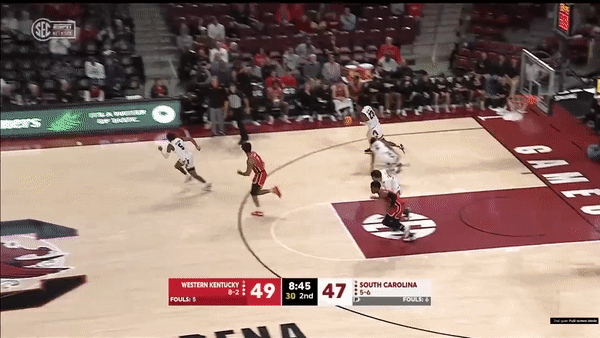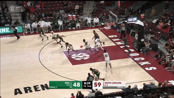 Here, Jackson pushes in transition and makes the hit-ahead pass to his teammate sprinting down the right sideline. The defense has yet to get set, and this pass allows South Carolina a quick route to the rim. Jackson’s pass isn’t complicated, but it is the proper read in transition that sets his teammate up for an easy layup. Unfortunately, the layup is missed, and the trailing big man gets the tip in. No assist.