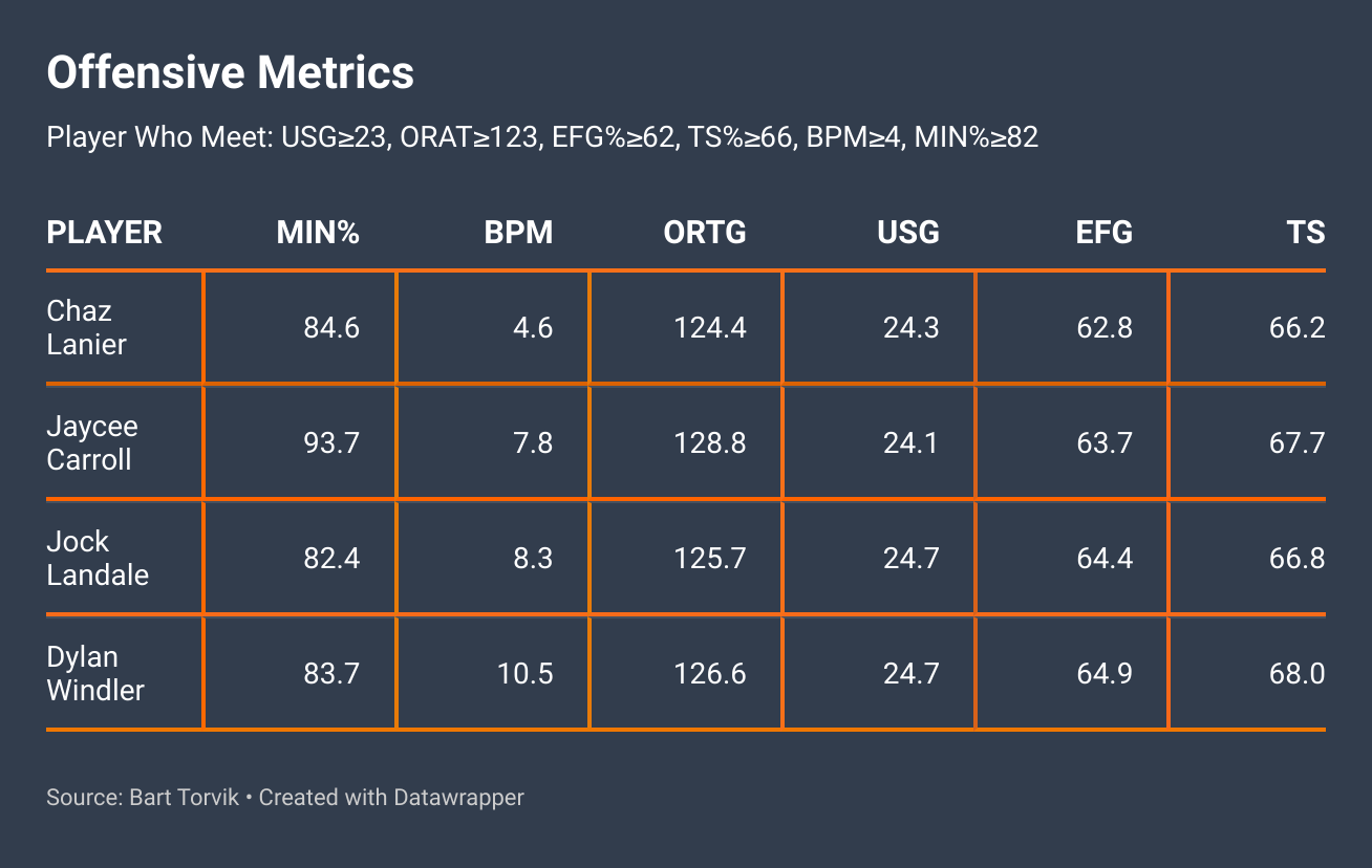What Chaz has been able to do this season has been one of offensive significance—not just for college players, but for all players dating back to 2008. With the applied filter above, only four players have registered similar seasons. Jock Landale and Dylan Windler have been on NBA rosters for several seasons, while Jaycee Carroll proved to be an international mainstay for 13 seasons.