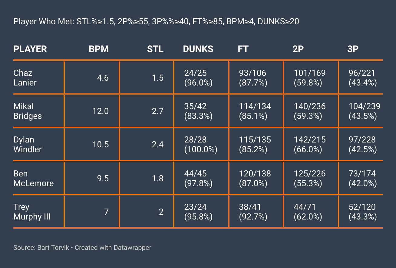 To put some of Chaz’s other metrics in comparison to others who have come before him, his shooting splits, dunks, and steals percentage are in line with only four other players: Mikal Bridges, Dylan Windler, Ben McLemore, and Trey Murphy III.