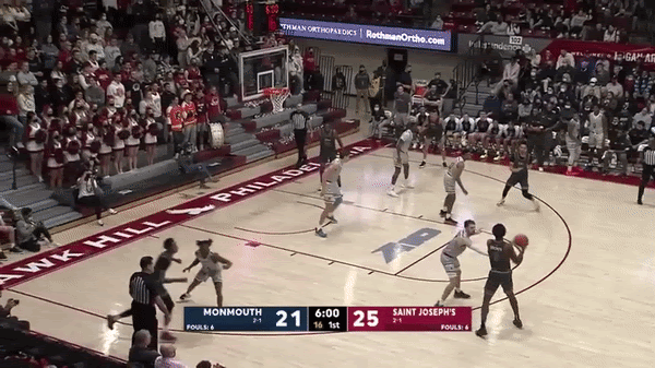 Jordan Hall does a great job utilizing his size and manipulation skills within PNR. He is able to see over the defense which allows him to make quick decisions and have better angles on passes over the top. However, he also showcases the ability to show patience and advantage creation when things might not be there right away. Lastly, he is really underrated when it comes to manipulation with pass fakes or hesitations as well. This all comes up again with hitting spot up shooters as well. St. Joe’s scores 1.15 PPP (points per possession) when Jordan Hall passes to the roll man out of PNR this season, which ranks in the 69th Percentile, via Synergy. This is a very good number and one that matches the eye test. Above is over 4 minutes worth of clips for your viewing pleasure, but let’s breakdown a few specific examples below: