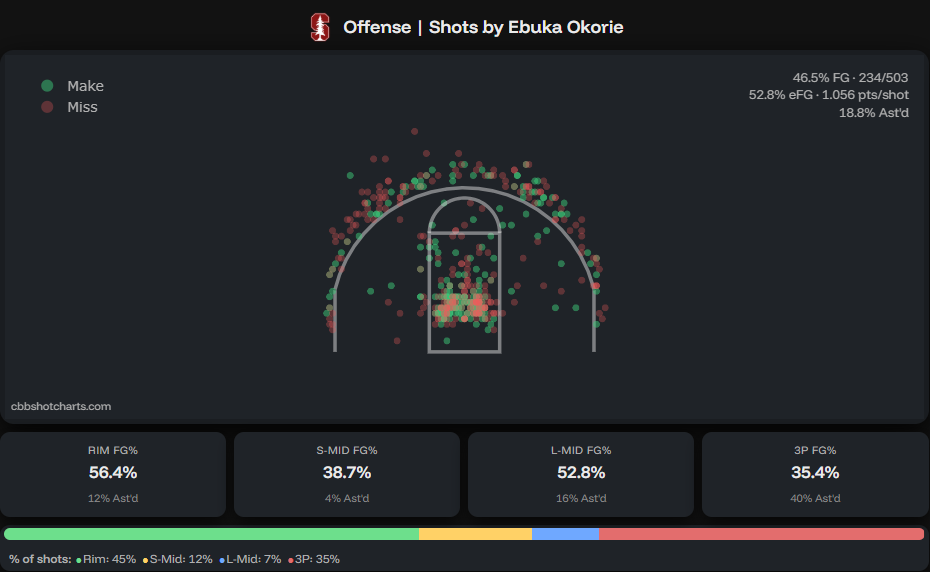 Stanford finished 65th in adjusted offensive efficiency, but the underlying indicators tell a different story. The Cardinals ranked 173rd in effective field goal percentage, 164th in free throw rate, 100th in three-point percentage, and 321st in assist rate. This was not an offense built on structure or shared creation; it was built on necessity, with Okorie at the center of it.