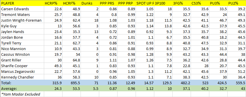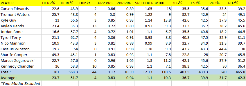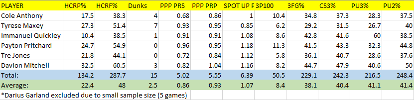 Next, I wanted to take a look into the Synergy numbers, particularly as it pertains to shot diet and overall efficiency. Here are the stats I looked at, and how I abbreviated them in the tables below: