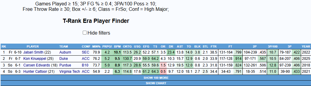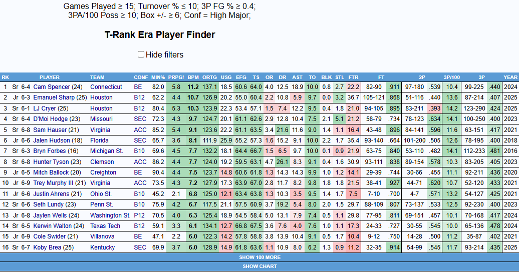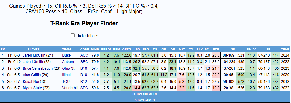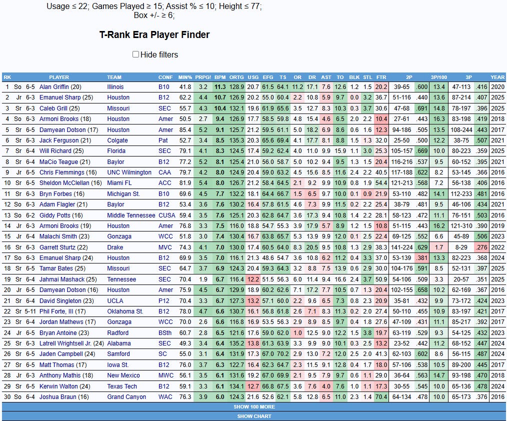 Let’s dive into players who had similar issues. To be more specific, productive players who dealt with similar issues. While McNeil may struggle in these respects, it’s important to make sure we’re looking at him within the context of other players who were in the vicinity of an NBA opportunity. McNeil had a 7.4 BPM in a limited role last year and a 9.8 BPM this year. There are always outliers (Ajay Mitchell had a BPM of 5.0 in his final college season, for instance), but usually, you want to see at least a BPM of around 6.0 for serious prospects, so that’s where I’m setting the cutoff today. I’ll also be limiting the query to players from within the last ten years, so that we’re dealing with a more up-to-date playstyle, generally speaking.