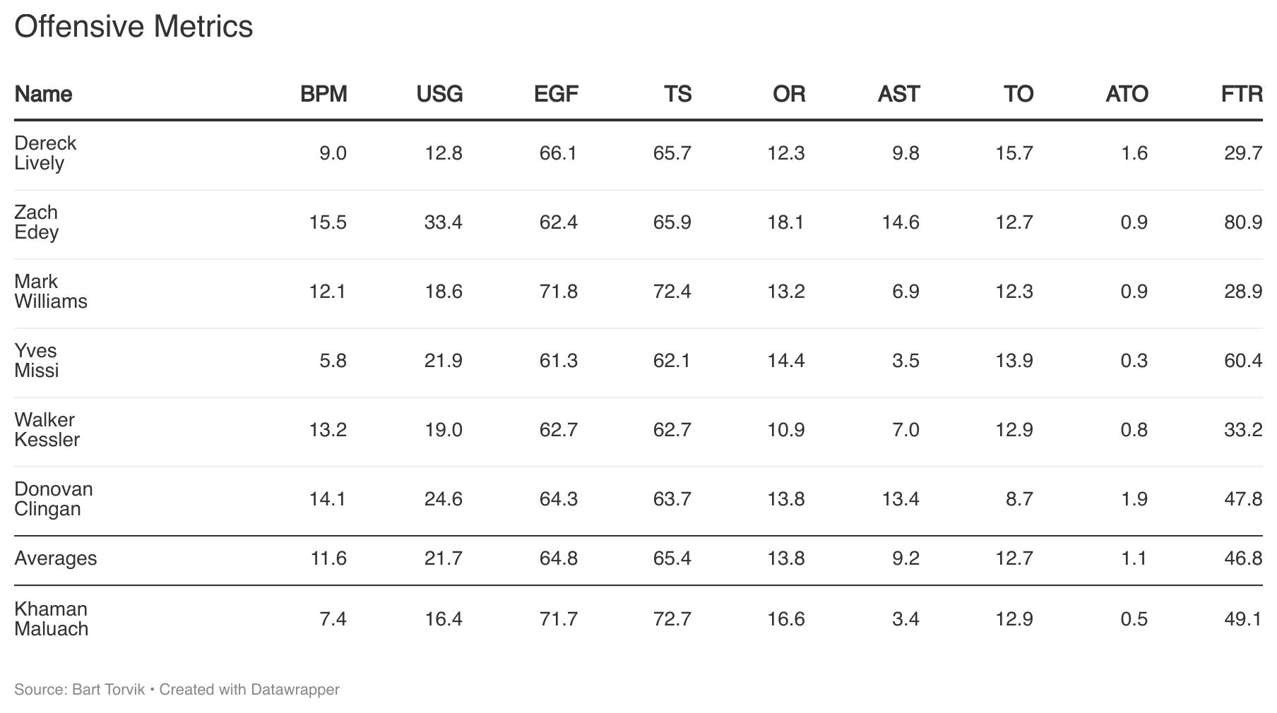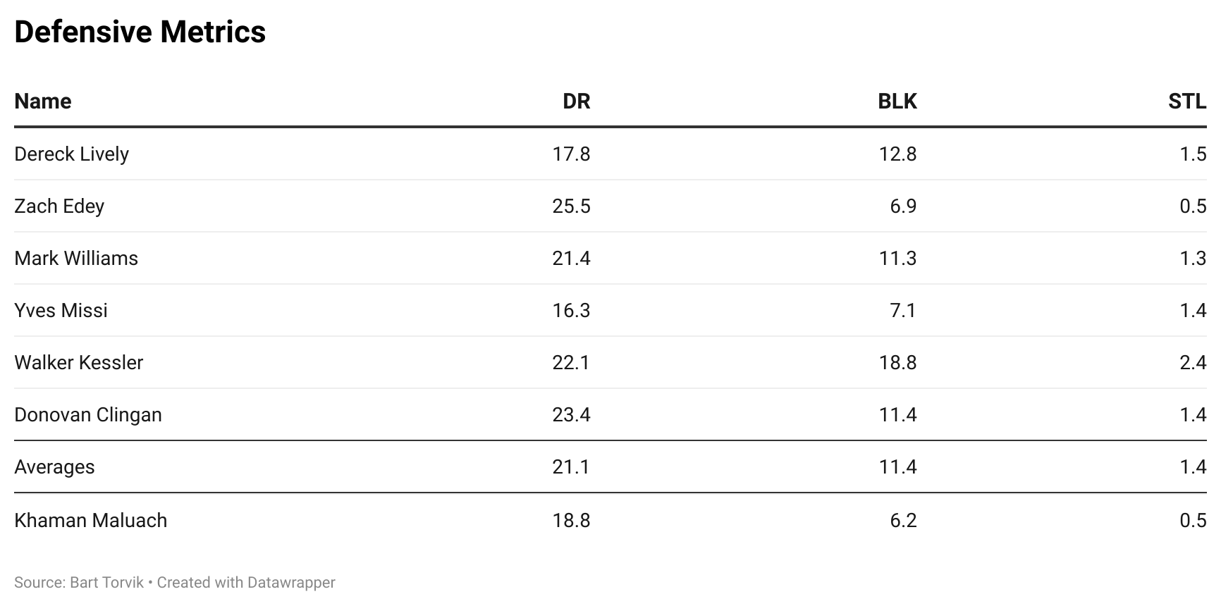 The metrics that Maluach has to this point are below the average of the recently drafted big men that he has been compared to in this piece. The defensive rebounding is fine, as he ranks higher than what we saw from Yves Missi and Dereck Lively. What appears to be more concerning is how far behind he ranks as a shot blocker. Of the group excluding Khaman, Zach Edey was the lowest-ranked shot blocker, but even he was better by more than half of a percent. Yves Missi was the second lowest, and he almost topped what we’ve seen from Maluach by almost an entire percentage point.
