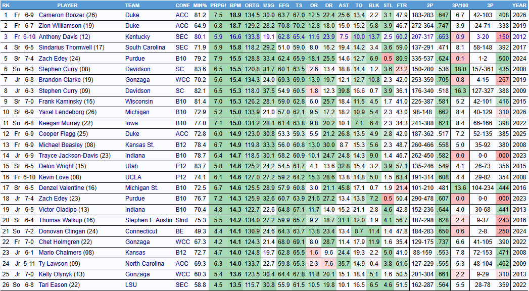 If you sort by “BPM” in the database, you’ll quickly see that the players that top this list are all NBA players who have found moderate success, at least. The list is filled with names like Zion Williamson, Anthony Davis, Stephen Curry, Kevin Love—you get the point; good players produce at their level of competition.
