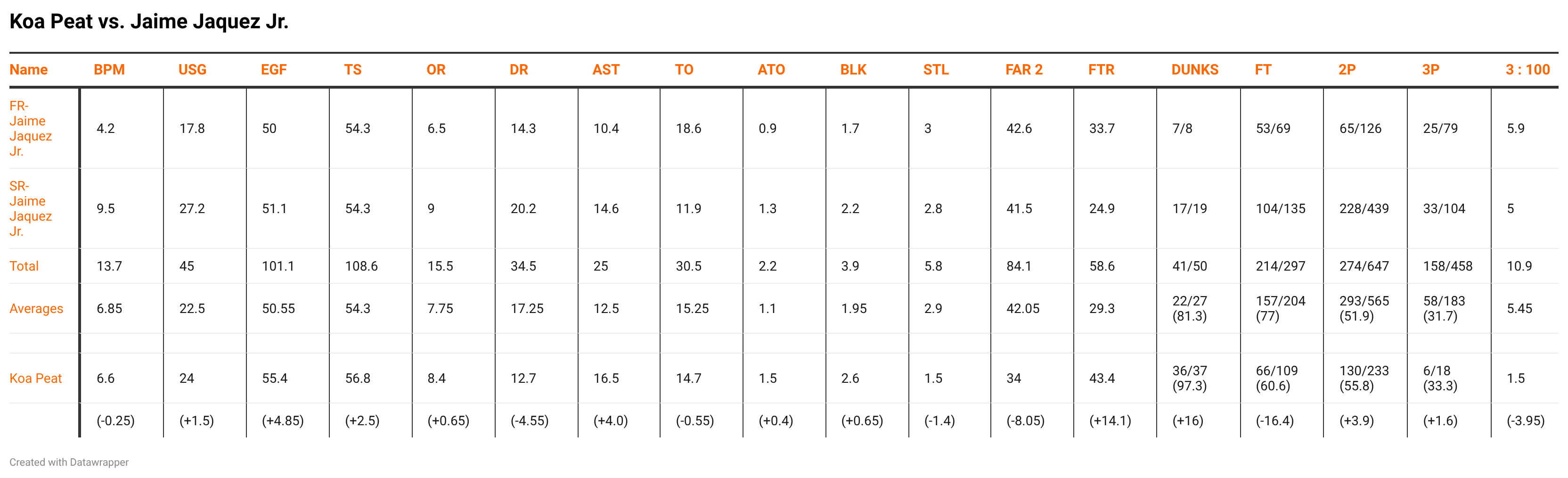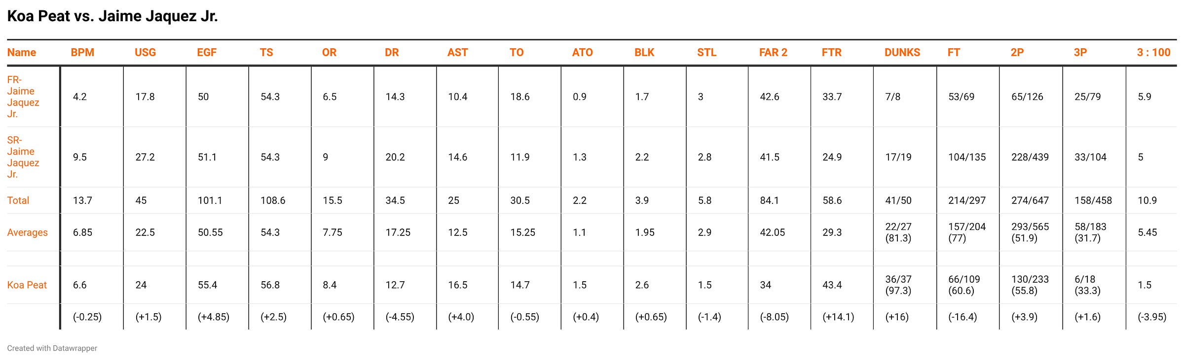 Compared to freshman year Jaquez, Peat is ahead offensively at the same stage. The only areas that freshman season Jaquez was better than Koa at is: Defensive Rebound Percentage, Steal Percentage, Long Two-Point Percentage, Free Throw Percentage and Threes per 100 Possessions. Even with the advantage that Jaime has had over Peat in touch indicators, Jaquez was a 32.2% shooter from deep as a rookie—and he has declined in percentage each season. The shooting projection for Koa appears bleak. However, the sample is small enough that becoming a 30-32% shooter from deep in the NBA is not out of the question.