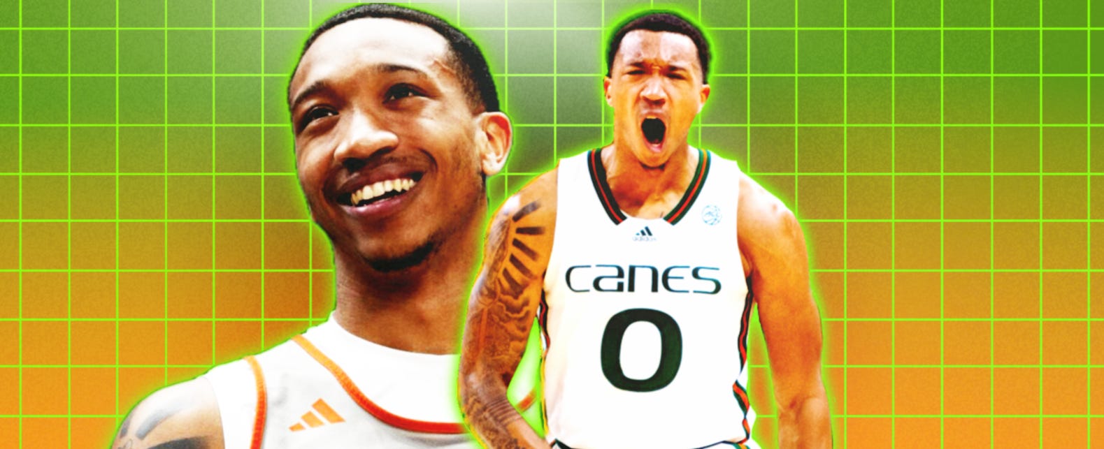Cleveland has always been a competent and frequent cutter, but this season he’s fully taking advantage of Miami’s more favorable spacing. When Cleveland cuts, he is scoring 1.667 PPP (93rd percentile). Here, we can see Georgia playing zone while Cleveland is on the left wing. As Nijel Pack makes the entry pass to Norchad Omier, all five defenders are ball watching and the two on Cleveland’s side have forgotten about him entirely. The defender on the block is forced to step to Omier, and Cleveland eagerly pounces on the cutting lane. Cleveland receives the bounce pass and does a tremendous job of adjusting his body to finish through the contact on the reverse.