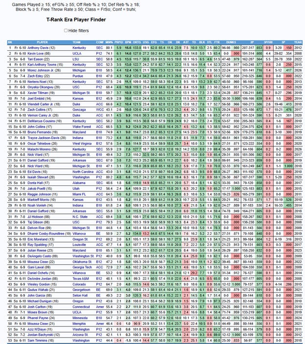Among that group, Johnson has one of the highest BPMs and the highest effective field goal rate. It also shows us that Johnson tends to play a lot bigger than he is and that there are some very realistic above-average outcomes—and no, Anthony Davis is not one of them. Someone like Isaiah Stewart is one of my favorite comparisons I’ve used all season, and we can see how similarly they line up. At first glance, Johnson feels like an archetype that historically has struggled to translate to the NBA, but when we dig a little deeper into how dominant some of his numbers really are, we find a lot of players with a pretty good track record.