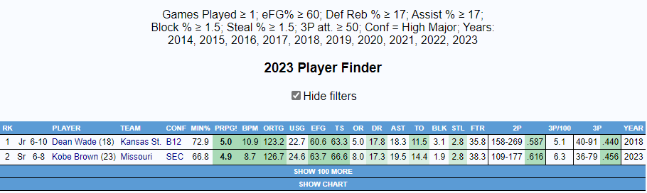 Right now, Kobe Brown has an EFG% of 63.7%, a DRB% of 17.2, an AST% of 19.5%, and a STL% of 2.8%. Sadly, he just misses the mark on BLK%, where he is at 1.9%. Even with that, he’s still in good company. If we drop the block rate for that threshold to 1.9, look at some of the players on this list! Keep in mind, this was filtered to only include high major players since 2014.